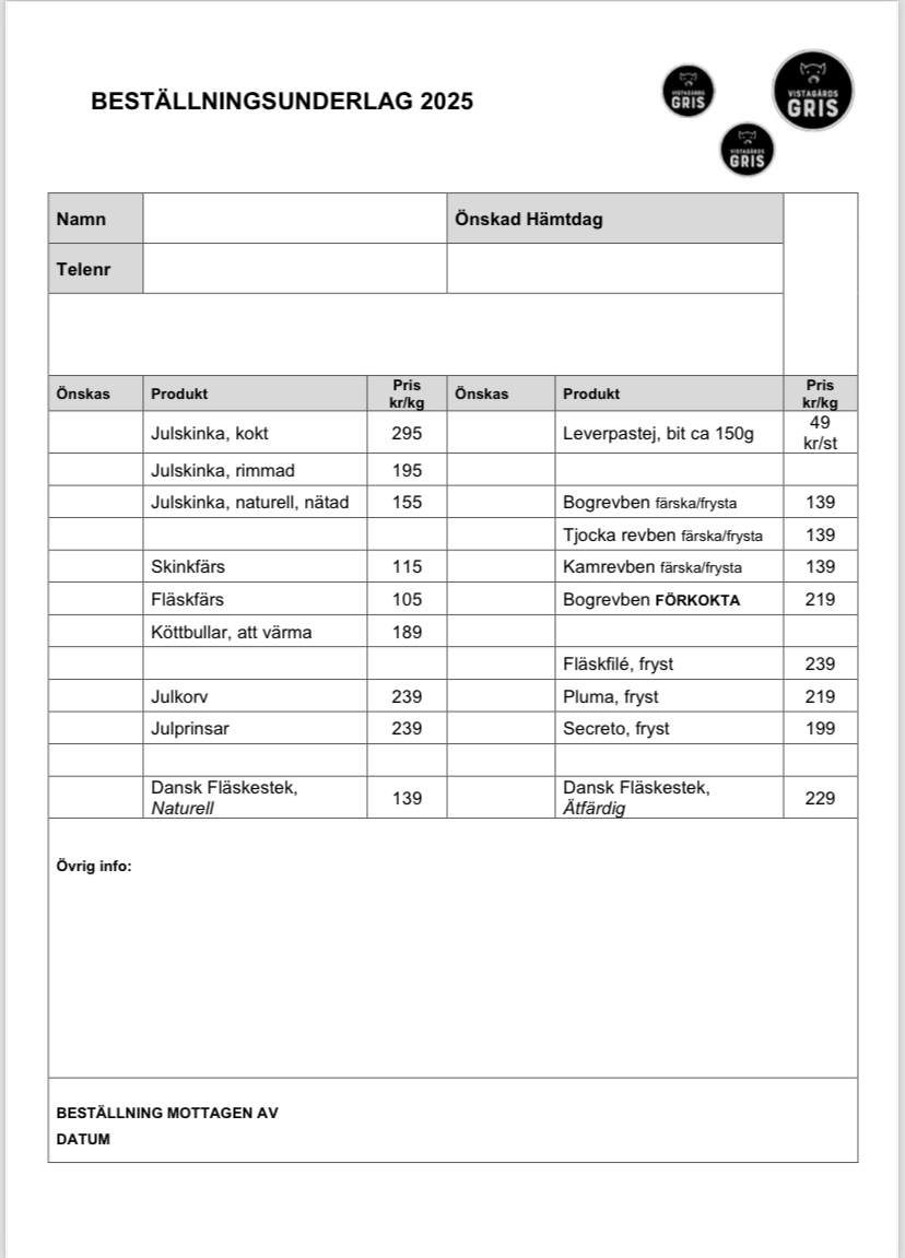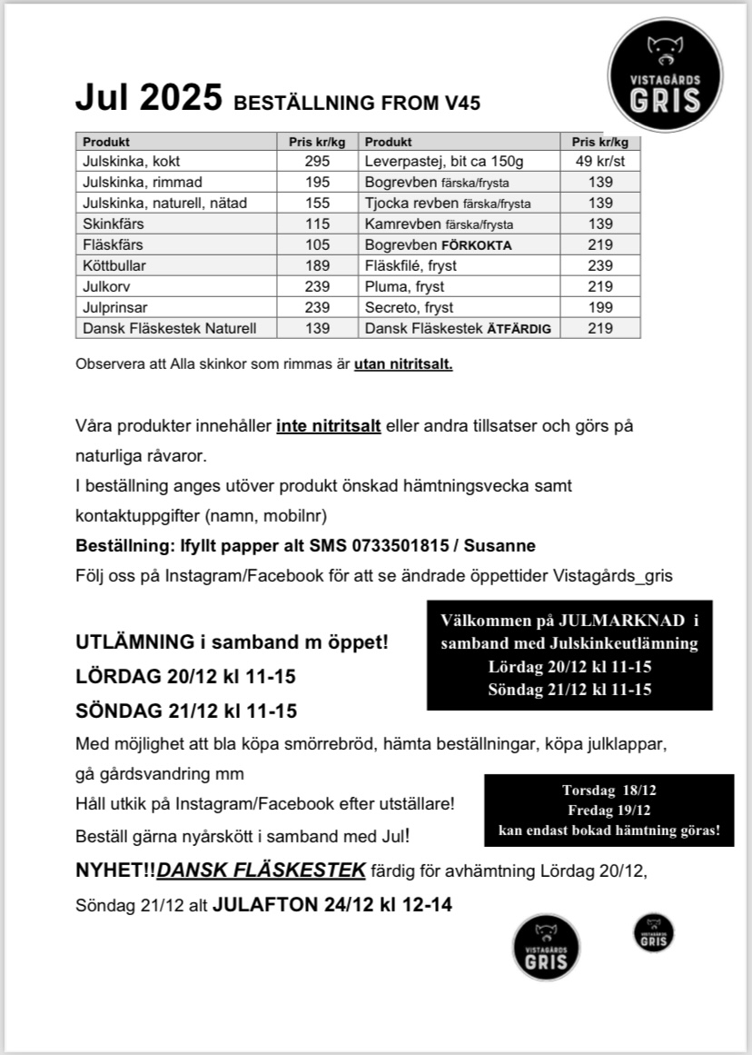 Här erbjuder vi färskt, nyslaktat och nystyckat griskött samt förädlade produkter, allt med mycket hög kvalitet. Allt kött kommer från Vistagårds eget slaktade och godkända grisar i vårt slakteri 797, där vi också styckar och bereder allt kött och alla rätter själva. Prova gärna vår egentillverkade korv eller bacon. Har vi inte det du söker så tar vi gärna emot önskemål.